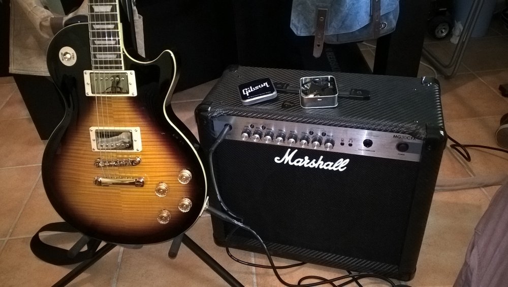 Ampli : Marshall MG30CFX - ça change légèrement le son et j'aime mieux le son sans la plaque.