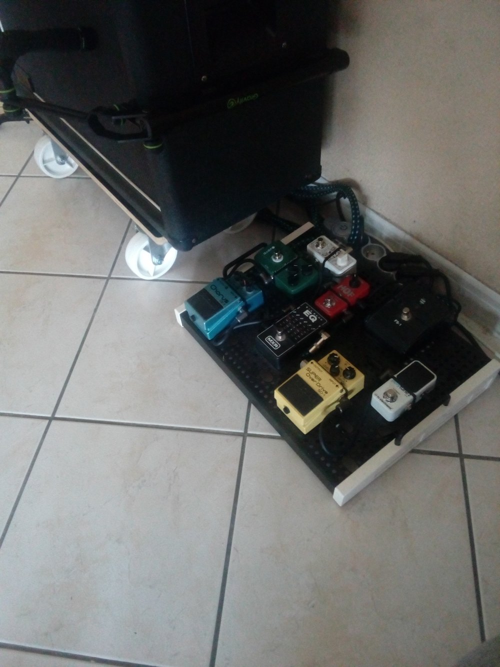 J'utilise ce Topic pour faire une vue de mon set quazi fini , après différentes variante de matos et test de pédales et du son qui me va bien , il ne me manque plus dans l'immédiat que d'un petit comp, bref , il ai pas trop charger , mais assez efficace pour les répètes du vendredi soir avec mes camarades