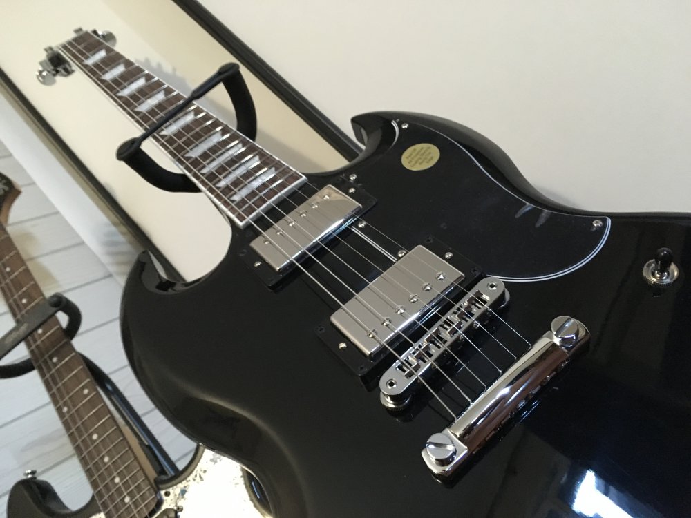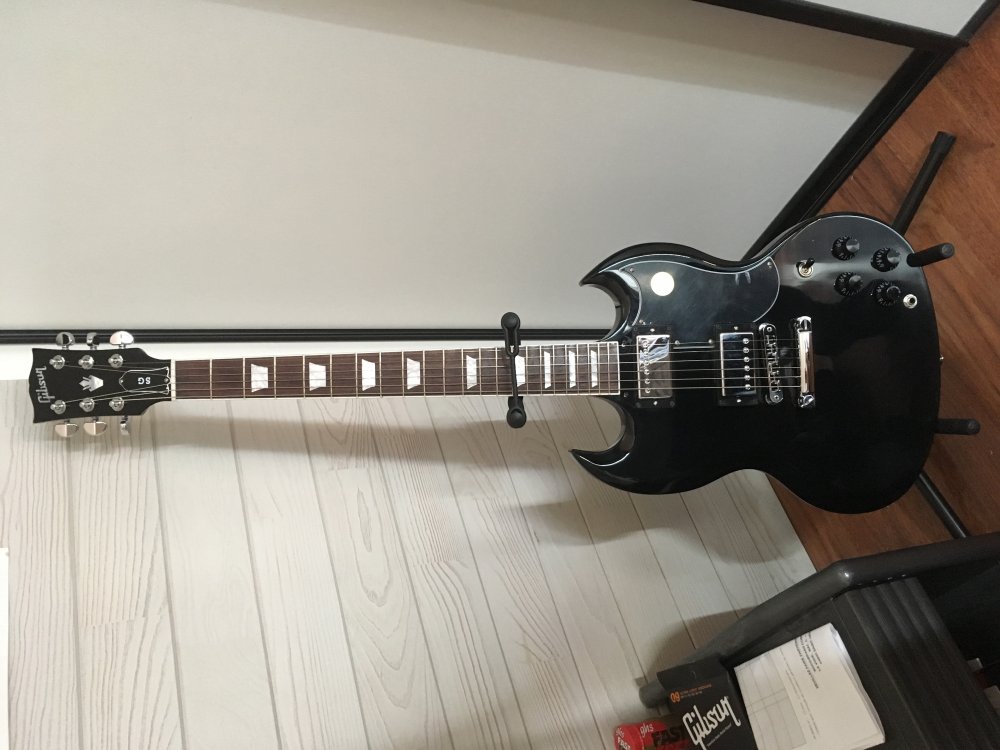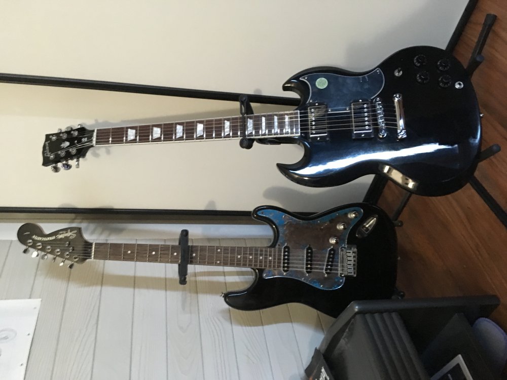 Guitare : Gibson SG std 2017 Ebony et Squier stratocaster black and chrome